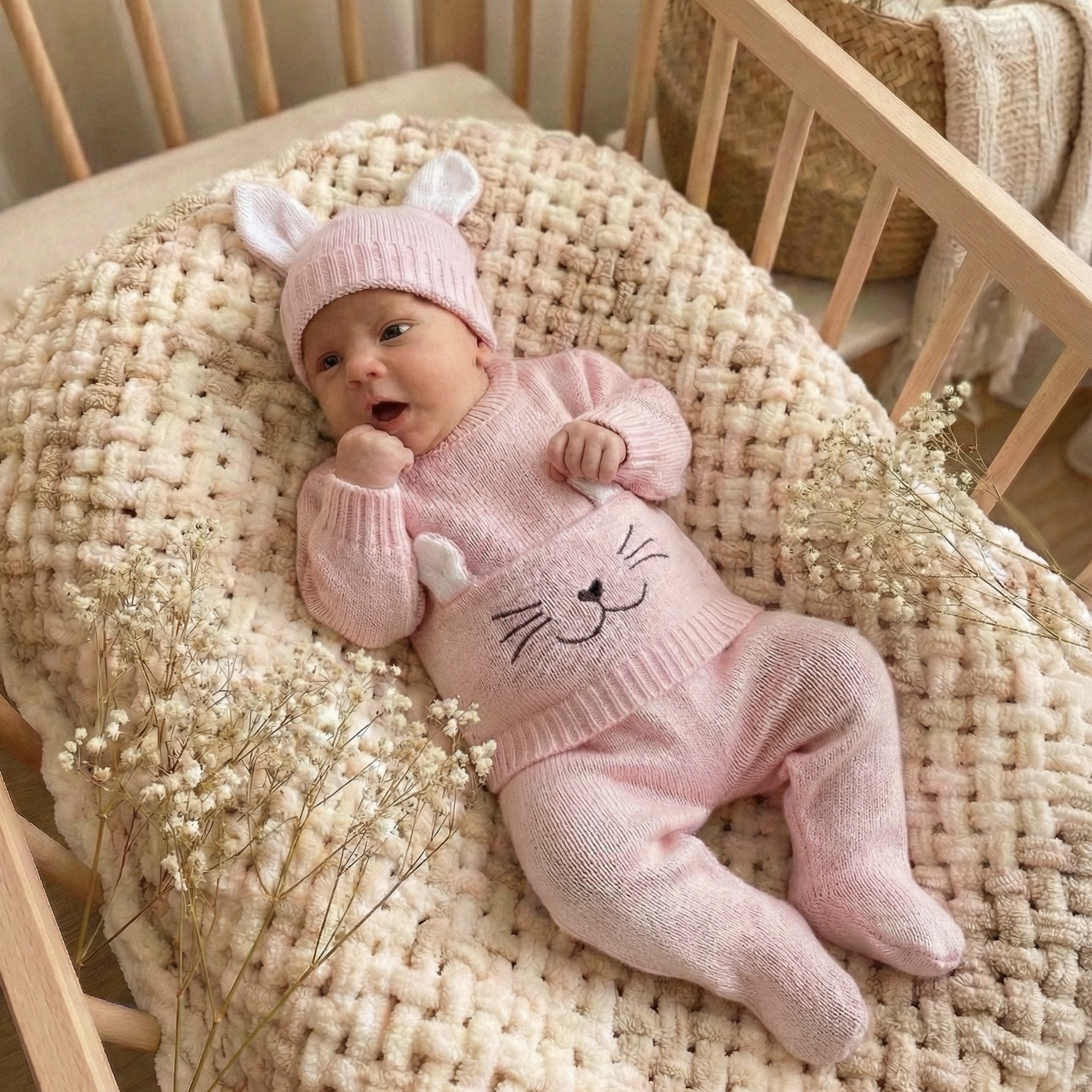 El Conjunto Ronroncitos es tejido 100% a mano por tejedoras colombianas en lana hipoalergénica, ideal para cuidar la piel del bebé con dulzura y estilo. Perfecto para sus primeros ronroneos de amor.