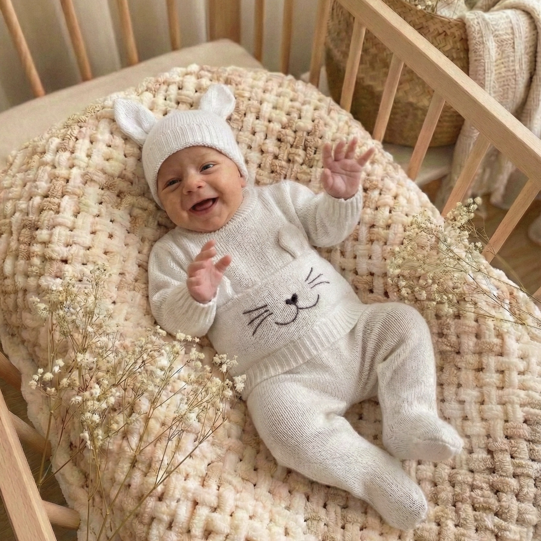 Confeccionado 100% a mano por tejedoras colombianas, utilizando lana hipoalergénica, suave y segura para la piel del bebé. Incluye un gorrito con orejitas de gatito, enterizo sin cola para mayor practicidad y cinco botones personalizados con el sello único de nuestra marca.